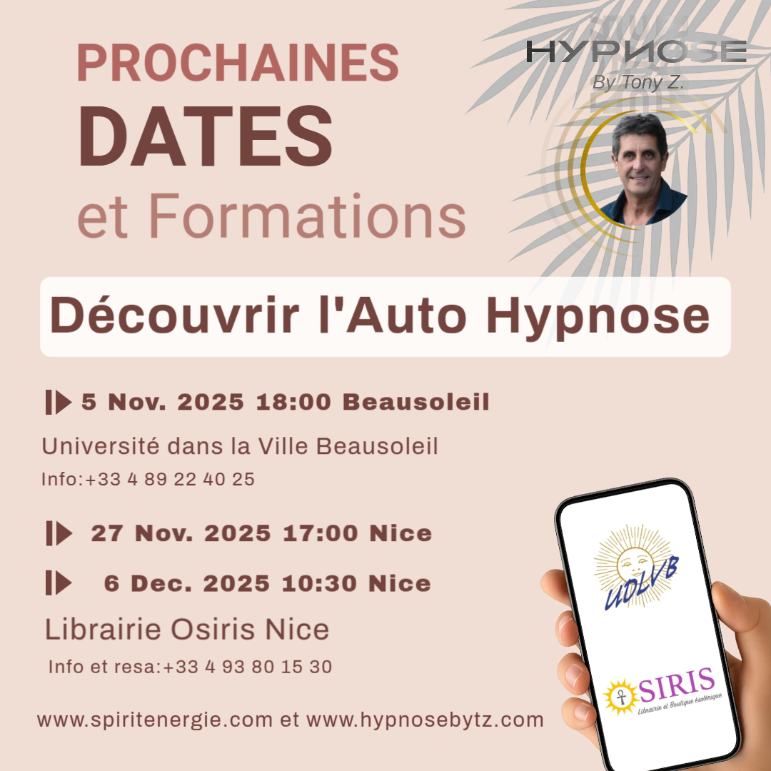 Librairie Osiris 8 Rue de Paris, NiceNous vous invitons à une série de formations qui vous permettront de découvrir et d’expérimenter l'auto-hypnose de manière simple et accessible. Ces sessions sont pensées pour vous guider à travers un processus doux et respectueux, où vous pourrez apprendre à vous connecter à votre propre potentiel.
